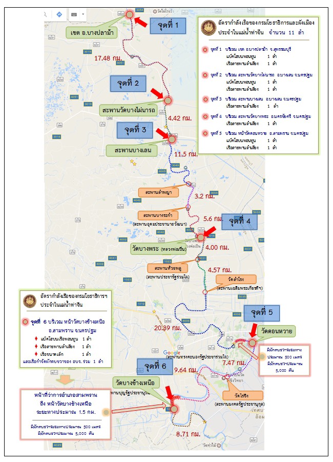 นายสมชาย เมธวัฒน์ธรากุล รองอธิบดีกรมโยธาธิการและผังเมือง กล่าวว่า กรมโยธาธิการและผังเมือง มีเรือดำเนินการแก้ไขปัญหาผักตบชวาอยู่ในแม่น้ำท่าจีนอย่างต่อเนื่องอยู่แล้ว โดยมีสถานีกั้นทุ่นดักผักตบชวา จำนวน 6 จุด ได้แก่ จุดที่ 1 บริเวณอ.บางปลาม้า จ.สุพรรณบุรี จุดที่ 2 บริเวณสะพานวัดบางไผ่นารถ จุดที่ 3 บริเวณสะพานบางเลน จุดที่ 4 บริเวณสะพานวัดบางพระ จุดที่ 5 บริเวณหน้าวัดดอนหวาย และจุดที่ 6 บริเวณหน้าวัดบางช้างเหนือ จ.นครปฐม และมีเรือดำเนินการจำนวน 11 ลำ ประกอบไปด้วย รถแบ็คโฮบนพอนทูน 4 ลำ เรือสายพานลำเลียง 6 ลำ เรือตักขนาดเล็ก 1 ลำ