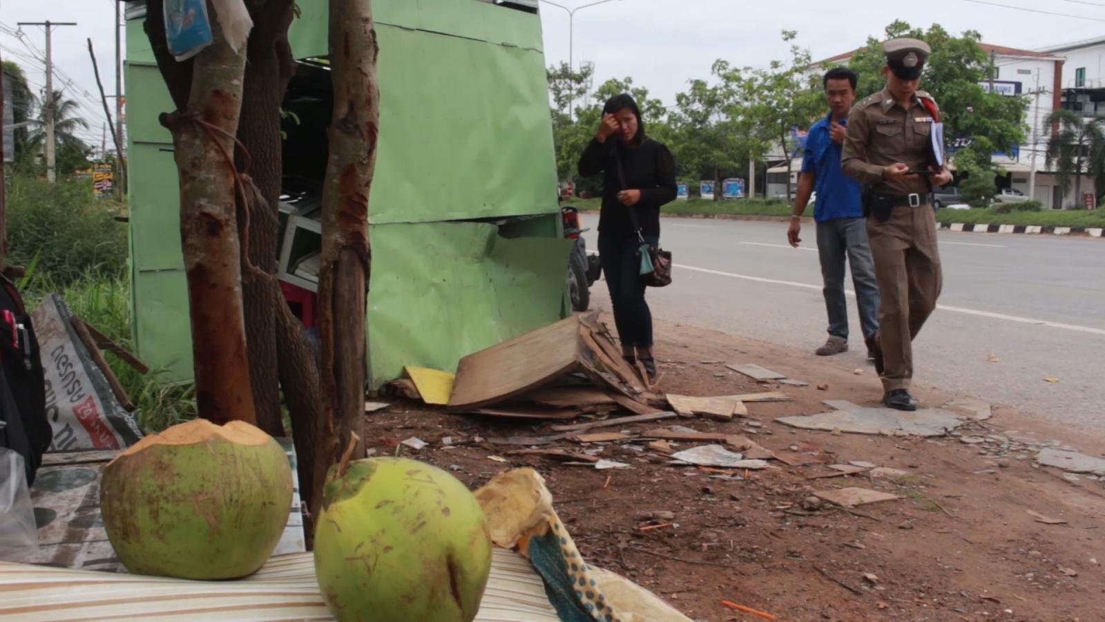 วันที่ 14 สิงหาคม 62 เวลา 10.00 น. ร.ต.ท.สถาพร ก้อนสันทะ รองสารวัตรสอบสวน สภ.เมืองอุดรธานี ได้รับแจ้งเหตุ มีรถยนต์ชนซุ้มร้านขายมะพร้าวน้ำหอม ตั้งอยู่ริมข้างทาง บริเวณถนนเลี่ยงเมือง ใกล้กับสถานี บขส.แห่งที่2 ตำบลบ้านเลื่อม อ.เมือง อุดรธานี จึงรุดไปตรวจสอบ