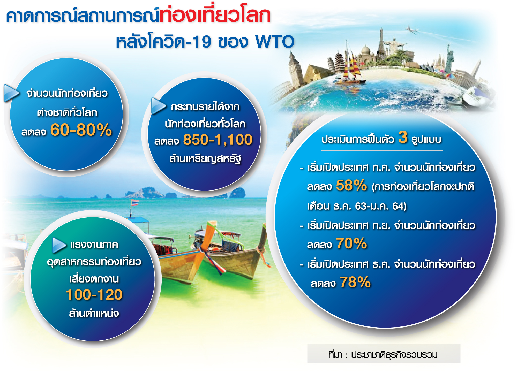 “แฮรี่ ฮวัง” ผู้อำนวยการภูมิภาคเอเชียและแปซิฟิก องค์การท่องเที่ยวโลก(World Tourism Organization : WTO) ระบุว่า วิกฤตการณ์โควิด-19 ส่งผลกระทบอย่างมากต่อการท่องเที่ยวในปี 2563 ทำให้แรงงานในภาคการท่องเที่ยวมีความเสี่ยงที่จะสูญเสียงานกว่า 100-120 ล้านตำแหน่งจำนวนนักท่องเที่ยวต่างชาติทั่วโลกลดลง 60-80% และส่งผลกระทบต่อรายได้จากนักท่องเที่ยวต่างชาติทั่วโลกให้ลดลงไปกว่า 850-1,100 ล้านเหรียญสหรัฐ