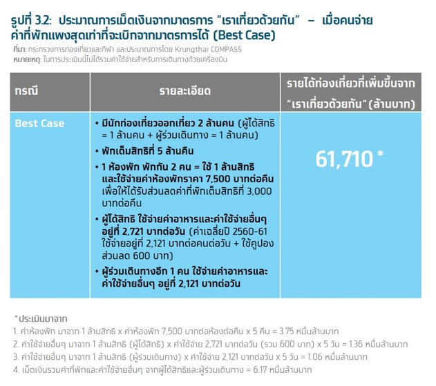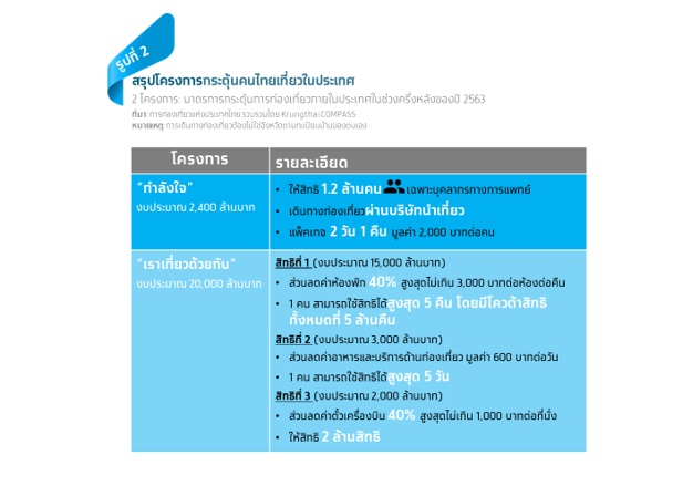 - Krungthai COMPASS ประเมินว่า มาตรการ “เราเที่ยวด้วยกัน” จะทำให้รายได้จากการท่องเที่ยวในประเทศเพิ่มขึ้นประมาณ 3.6-6.2 หมื่นล้านบาท
