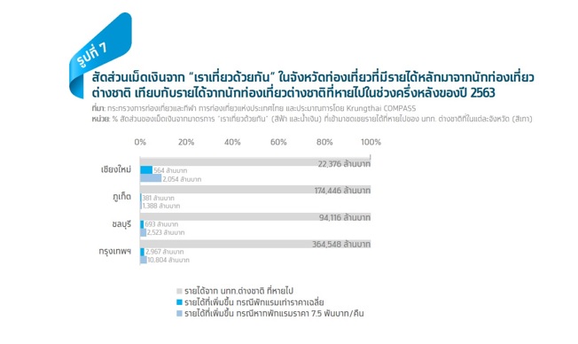 ตัวอย่างจังหวัดในกลุ่มดังกล่าว ได้แก่ กรุงเทพฯ ภูเก็ต ชลบุรี เชียงใหม่ (กลุ่มจังหวัดที่ 1 ในรูปที่ 5) ซึ่งมีสัดส่วนรายได้จากนักท่องเที่ยวต่างชาติในสัดส่วนที่สูงถึง 40-89% แม้คนไทยที่ได้รับสิทธิจาก “เราเที่ยวด้วยกัน” จะไปเที่ยวจังหวัดเหล่านี้ตามผลสำรวจ แต่ก็ชดเชยรายได้จากนักท่องเที่ยวต่างชาติที่หายไปได้เพียง 0.5-9% เท่านั้น (รูปที่ 7) ส่วนกลุ่มจังหวัดที่พึ่งพารายได้จากนักท่องเที่ยวต่างชาติและคนไทยไม่ได้นิยมไปอย่างเช่น กระบี่ พังงา “เราเที่ยวด้วยกัน” ก็ไม่น่าจะชดเชยรายได้จากนักท่องเที่ยวต่างชาติที่หายไปจำนวนมากได้เช่นกัน