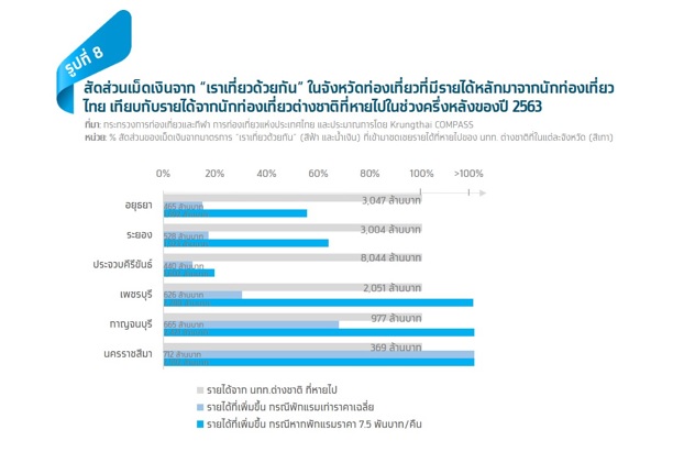 - แม้รายได้ท่องเที่ยวจากผู้ใช้สิทธิ “เราเที่ยวด้วยกัน” จะไม่สามารถชดเชยรายได้ต่างชาติที่หายไปในเมืองท่องเที่ยวใหญ่ๆอย่าง กรุงเทพฯ ภูเก็ต เชียงใหม่ ชลบุรี ได้ แต่สามารถชดเชยรายได้ต่างชาติที่หายไปในจังหวัดที่คนไทยนิยมท่องเที่ยว และมีรายได้จากต่างชาติไม่มากได้ อย่าง นครราชสีมา เพชรบุรี เป็นต้น
