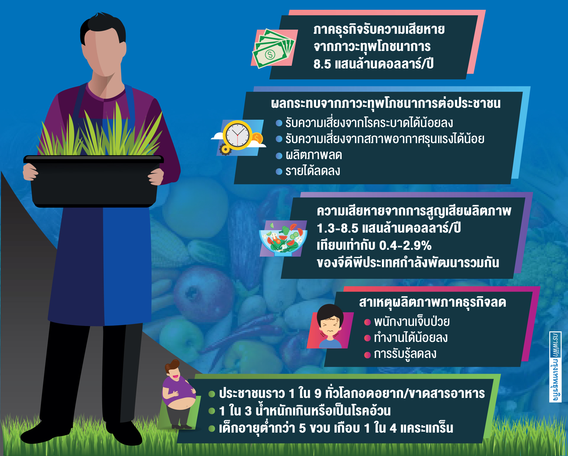 แต่ความเสียหายที่บริษัทต้องแบกรับเพราะแรงงานและประชาชนขาดสารอาหารยังไม่มีใครศึกษารายงานโภชนาการโลก ประจำปี 2563 พบว่าความอดอยาก ทุพโภชนาการ และโรคอ้วนไม่ใช่แค่ปัญหาทางสุขภาพในประเทศกำลังพัฒนา แต่ยังมีความเสียหายทางเศรษฐกิจที่ภาคธุรกิจต้องแบกรับถึงปีละ 8.5 แสนล้านดอลลาร์