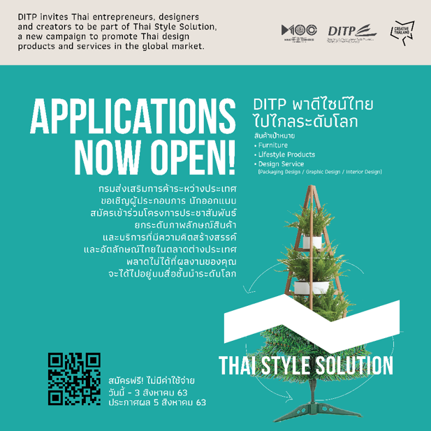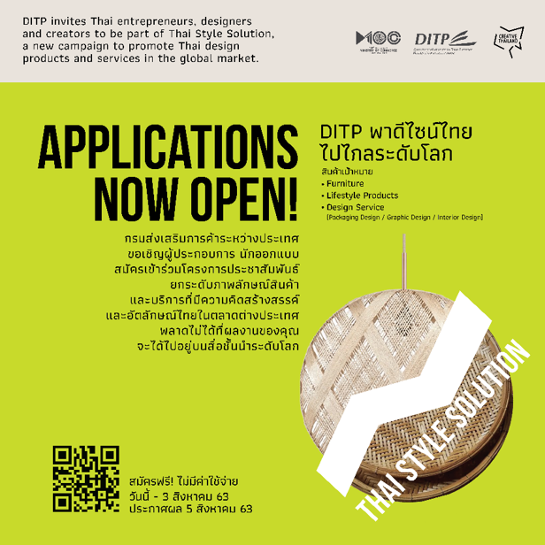 กรมส่งเสริมการค้าระหว่างประเทศ (DITP) เชิญชวนผู้ประกอบการและนักออกแบบ ในกลุ่มสินค้าเฟอร์นิเจอร์ (Furniture), สินค้าไลฟ์สไตล์ (Lifestyle Products) และธุรกิจบริการออกแบบ (Design Services)