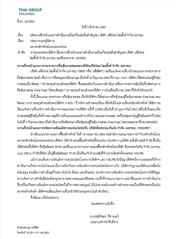 ทั้งนี้เรื่องแผนการกระจายการถือหุ้นรายย่อย เพื่อให้บริษัทมีสัดส่วนการถือหุ้นของผู้ถือหุ้นรายย่อย (Free float) ครบ 15.00% ของทุนชำระแล้วของบริษัทภายใน 1 ปี หลังการเข้าจดทะเบียน เพื่อให้เป็นไปตามเงื่อนไขรับหลักทรัพย์ บริษัทขอแจ้งความคืบหน้าการดำเนินการว่าคณะกรรมการบริษัท ครั้งที่ 2/2563 เมื่อวันที่ 25 กุมภาพันธ์ 2563ได้มีมติเห็นชอบเพื่อนำเสนอต่อผู้ถือหุ้นเพื่อพิจารณาอนุมัติการเพิ่มทุนแบบมอบอำนาจทั่วไป (General Mandate) ต่อที่ประชุมสามัญผู้ถือหุ้นประจำปี 2563 ในวันที่ 3 กันยายน 2563 เพื่อดำเนินการเพิ่มสัดส่วนการถือหุ้นของผู้ถือหุ้นรายย่อย (Free Float)ในช่วงระยะเวลาที่เหมาะสมต่อไป