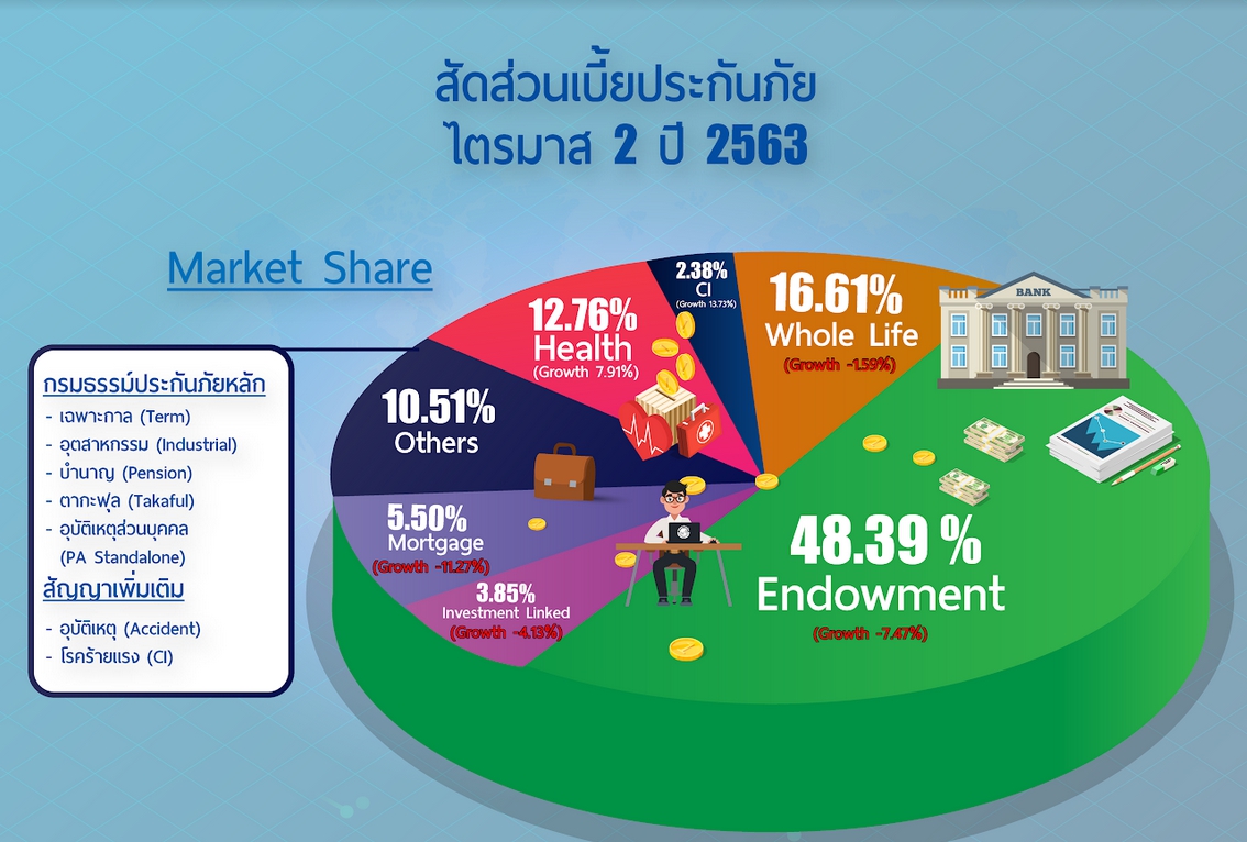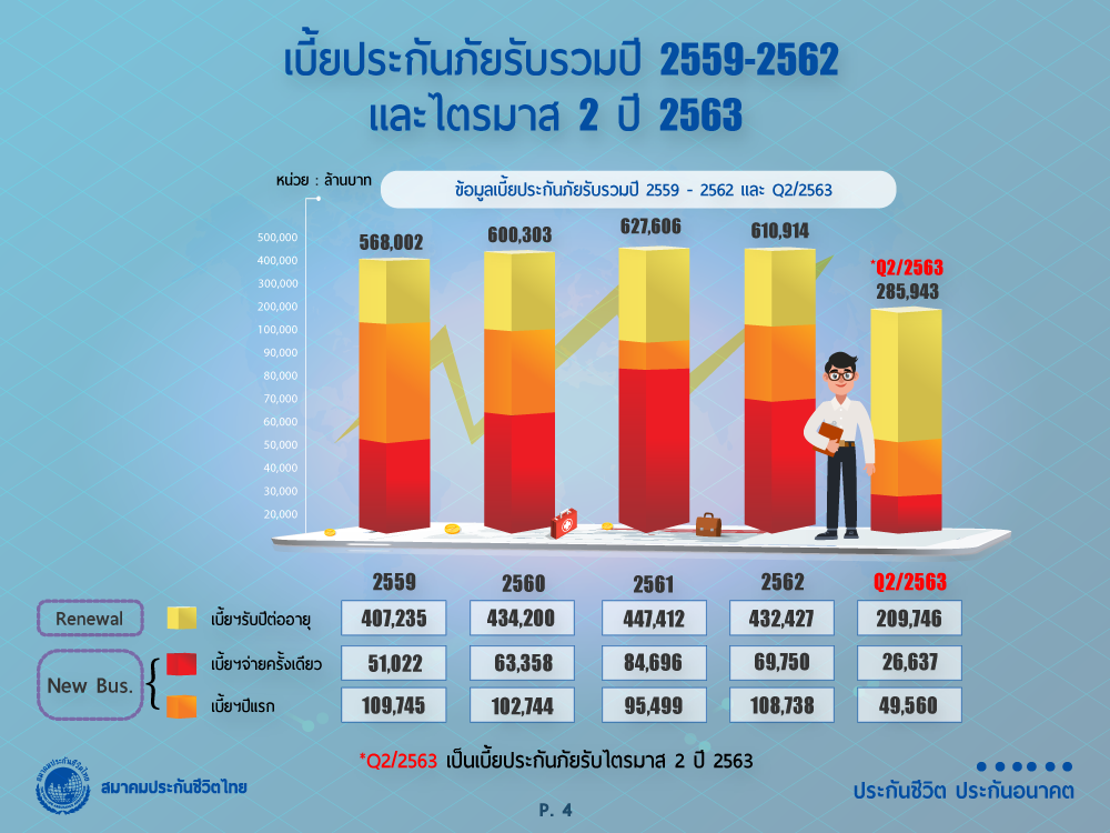 ส่วนครึ่งปีแรกของปี 63 พบว่าธุรกิจประกันชีวิตมีเบี้ยรับรวมทั้งสิ้น 285,942.47 ล้านบาท ลดลง 3.27% เมื่อเทียบช่วงเดียวกันปีก่อน จำแนกเป็นเบี้ยประกันภัยรับรายใหม่ จำนวน 76,196.28 ล้านบาท ลดลง 9.29% และเบี้ยประกันภัยรับปีต่อไปจำนวน 209,746.19 ล้านบาท ลดลง 0.88% และมีอัตราความคงอยู่ของกรมธรรม์ประกันชีวิต 81%